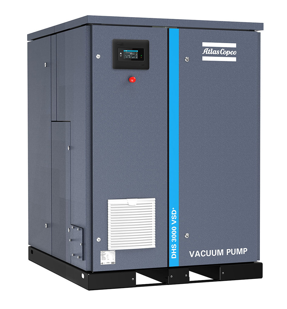 Atlas Copco developed the dry screw vacuum pump DHS 3000 VSD+ specifically for massive flow industrial applications. As dry technology, it is well suited for paper processing, conveying technologies, pick-and-place applications in the food industry, and as a central vacuum system. Powered by a highly efficient IE4 motor with a patented asymmetrical rotor design, users benefit from energy savings of up to 50 percent compared to competitive products. The low-maintenance, compact vacuum pump has a pleasantly low noise level and also runs vibration-free.